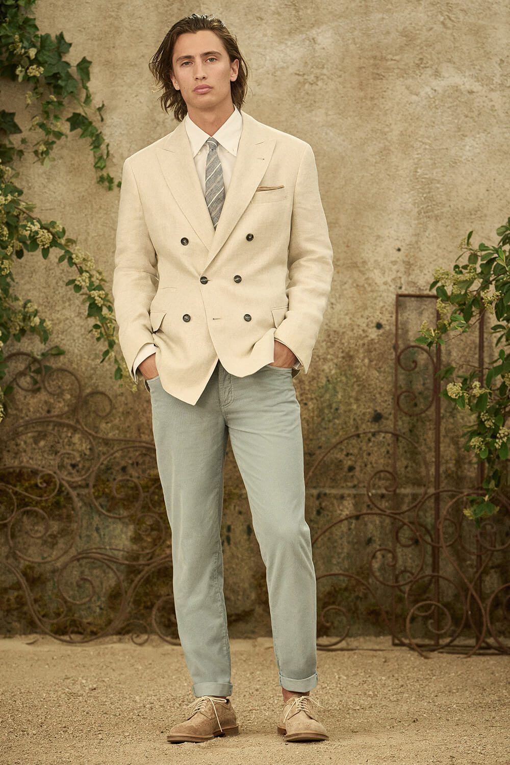 That might feel like a dandy step too far, so an easy way to embrace the fun in modern tailoring is with accessories. Brooches, lapel chains and neck scarves instantly transform a suit, even those steeped in old-school tradition, like pinstripes. You could also try a statement cowboy belt or an eye-catching man bag. And it’s an affordable hack to give your existing suit line-up a new vibe.