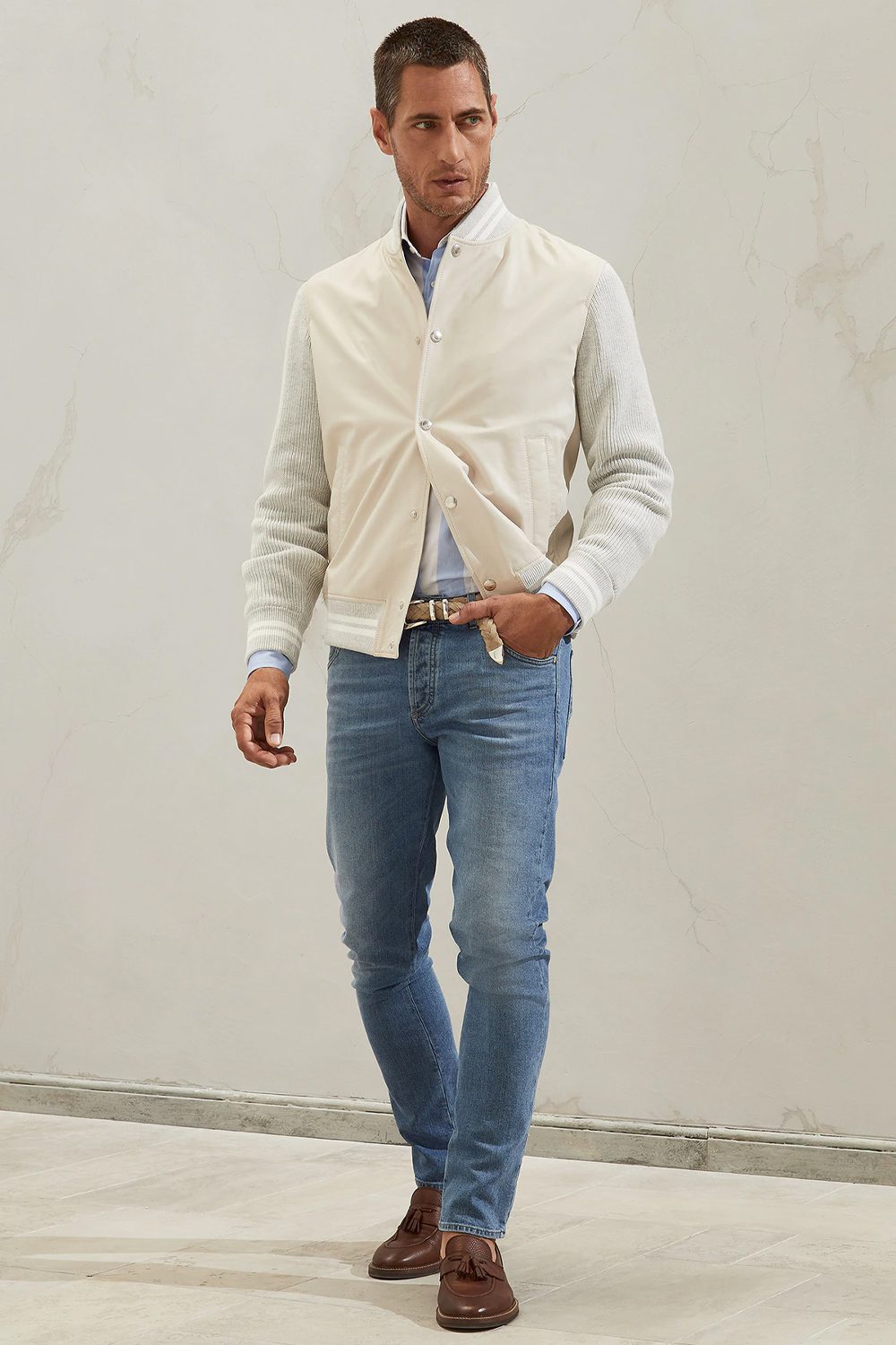 It is possible to dress smart casual without actually switching up your style. Simply look out for casual pieces you’re already comfortable with, but cut in more luxurious fabrics. Bomber jackets in suede or leather; T-shirts in merino wool; knitwear in cashmere. These are all pieces usually worn in casual settings, but when made from these fabrics they take on a smarter look that’s perfect for combining with chinos and Derbies.